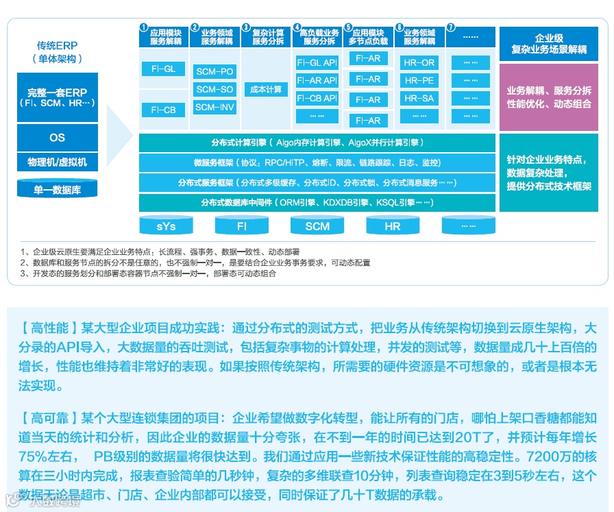 从如下的示意图可以看出,左边是传统ERP的单体架构,完整的一套ERP,由经典的三层架构组成。右边是金蝶云·苍穹分布式的企业级云原生架构,在底层数据库做了应用的拆分,在数据库上层做了很多的分布式框架设计,包括分布式数据库中间件,分布式服务框架以及面向应用的微服务框架,保证运算效率的分布式计算引擎等等。