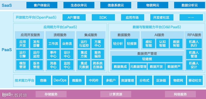 ● 开放能力平台:以API、ISV应用市场为基础,支持技术开放,构建共赢生态。任何企业不可能只有一家供应商,一个技术栈,更不可能一辈子只使用一套信息化平台。企业需要各种各样的API管理整个通用SDK,甚至是一个应用商店和开发者社区,让所有的应用(同质的、异构的)都可以很好融合、集成、管理、分发,构建前端不同的SaaS应用,无论是面向客户体验,还是面向渠道生态、采购商生态、管理的生态、战略的生态等。我们认为所有的SaaS要基于统一的PaaS平台来构建,这种方式是效率最好的方式。