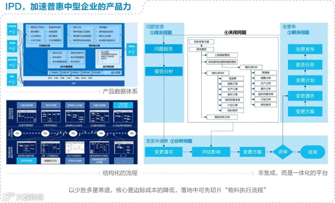 企业最关注的是以少量的产品博得更广阔的市场竞争力,并获得更高的收益,其核心逻辑就在于边际成本的降低。因此,企业的研发管理可以选择一个点切入,实现“以少胜多”。企业短期内可以聚焦结构化流程,例如“物料执行流程”,在新增一个物料的时候,通过结构化流程到 ERP,促使变更流程敏态响应,在研发设计的时候,根据ERP的相关历史结果去优选物料,而不是先研发再制造,研发是研发,制造是制造,最后变成“不可制造”。