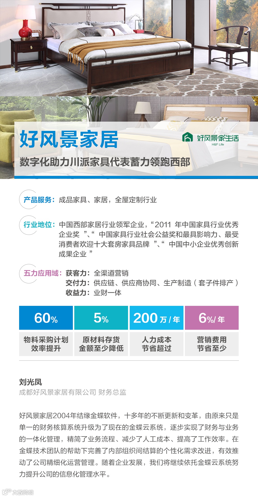 好风景通过与金蝶合作,通过金蝶云·星空实现从家具家居的研发、生产到线下销售,逐步转变为能敏捷响应市场需求变化,快速实现产品从研发到销售,打通线上线下销售渠道,通过运营转型,助力川派家具代表好风景继续领跑西部。