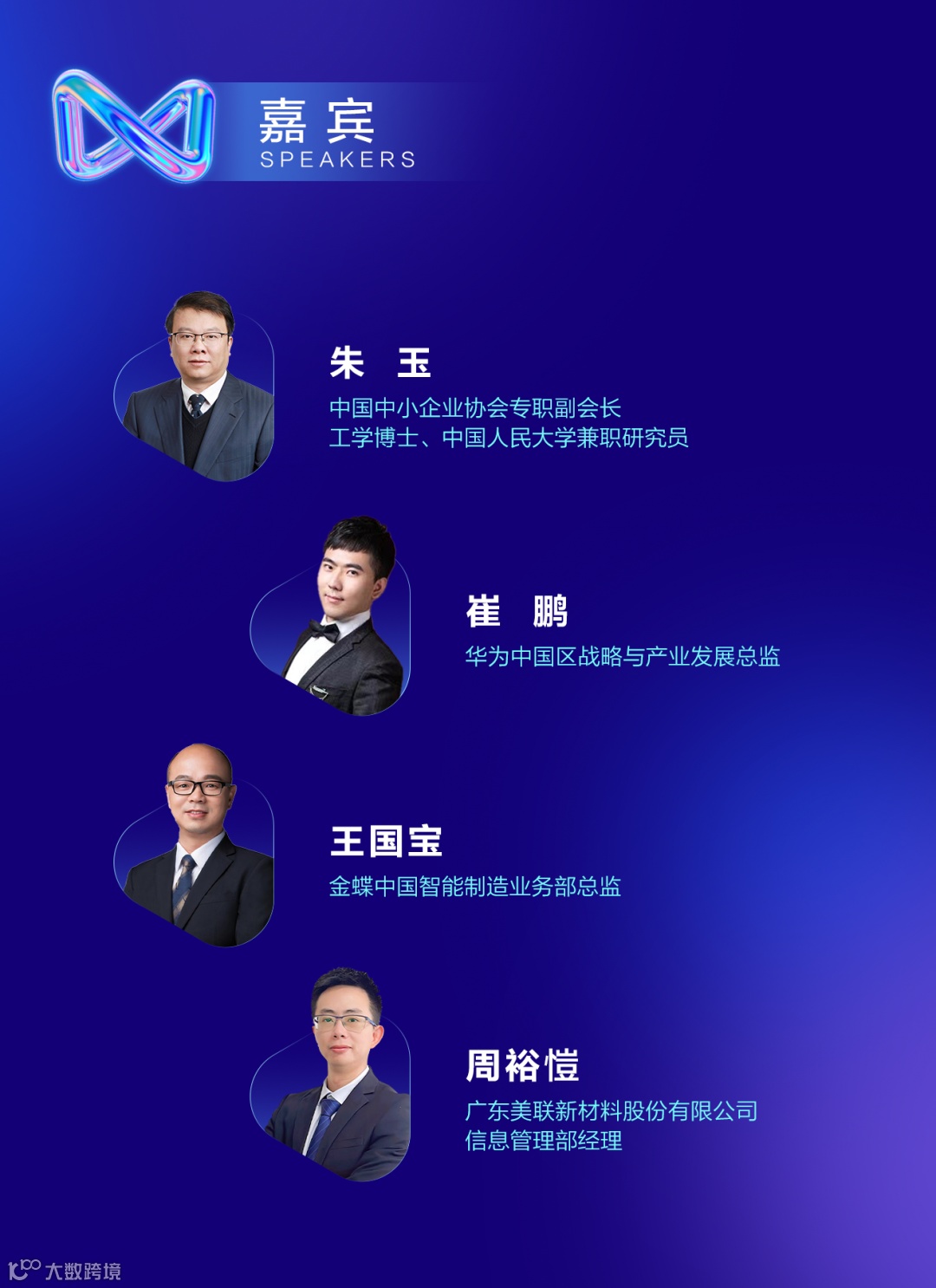 本次大会诚邀中国中小企业协会专职副会长朱玉、华为中国区战略与产业发展总监崔鹏、金蝶中国智能制造业务部总监王国宝、广东美联新材料股份有限公司信息管理部经理周裕愷等行业重磅专家出席会议,集合中国中小企业协会的行业沉淀、华为云与金蝶云·星空的云服务成功实践,与众企业家共同探讨如何抓住新《办法》机遇,通过科学规划及数字化转型实现企业成长新高度。