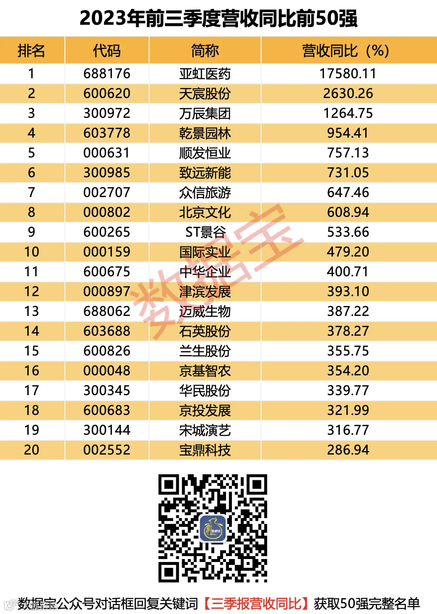 从营收增长幅度来看,亚红医药、天宸股份、万辰集团3家公司的前三季度营业收入同比超10倍增长。