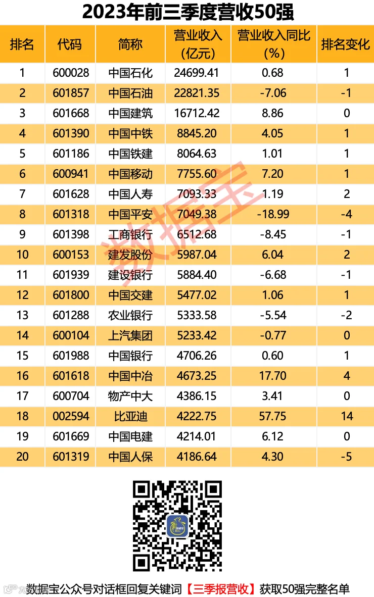据此,证券时报·数据宝推出三季报系列数据报道,本篇为三季报业绩概览,2023年《三季报A股营收50强》《三季报A股净利润50强》出炉。