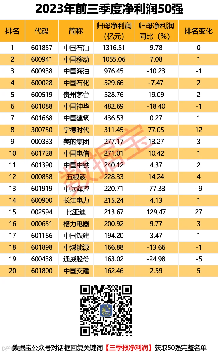 排除银行、非银金融上市公司,还有36家上市公司三季度净利润超百亿元。具体来看,中国石油、中国移动净利润超千亿元;“三桶油”依然稳居前五,三季度合计归母净利润2822.62亿元。