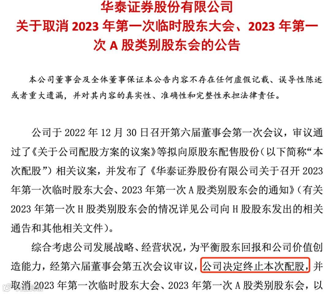 为此,华泰证券还取消了原定举办的2023年第一次临时股东大会、2023年第一次A股类别股东会及2023年第一次H股类别股东会,以及取消原定于上述股东大会审议的全部议案。
