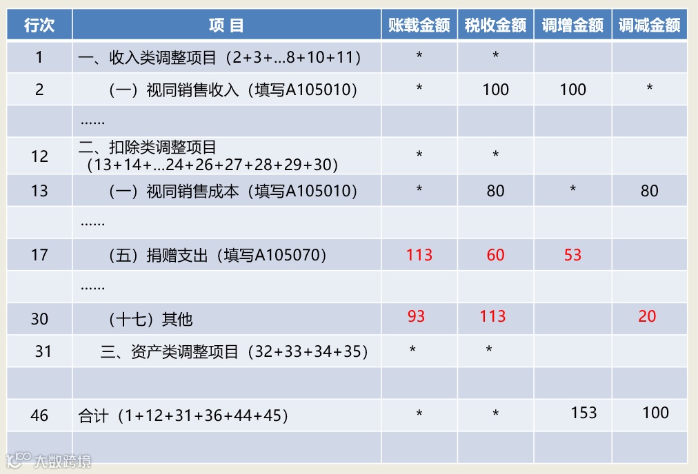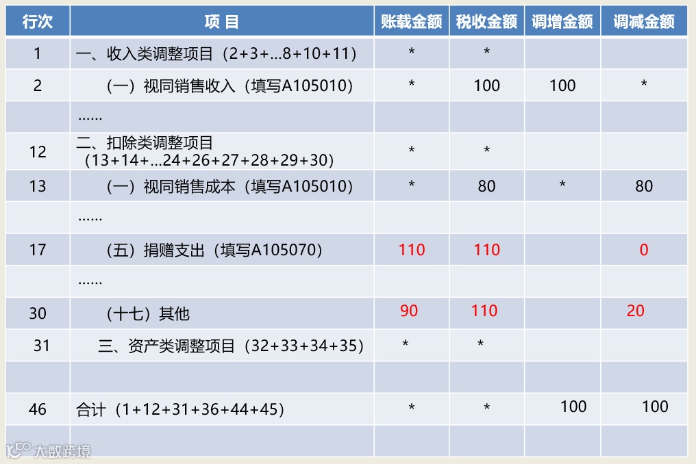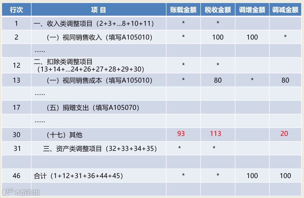 A105000 纳税调整明细表:第30行“(十七)其他”:填报其他因会计处理与税收规定有差异需纳税调整的扣除类项目金额,企业将货物、资产、劳务用于捐赠、广告等用途时,进行视同销售纳税调整后,对应支出的会计处理与税收规定有差异需纳税调整的金额填报在本行。若第1列≥第2列,第3列“调增金额”填报第1-2列金额。若第1列<第2列,第4列“调减金额”填报第1-2列金额的绝对值。