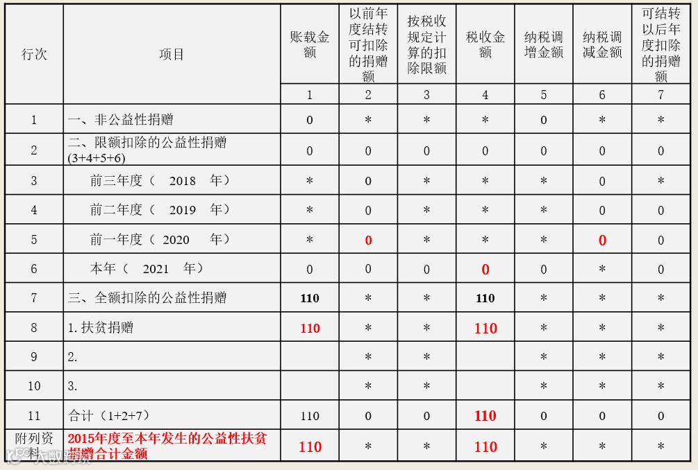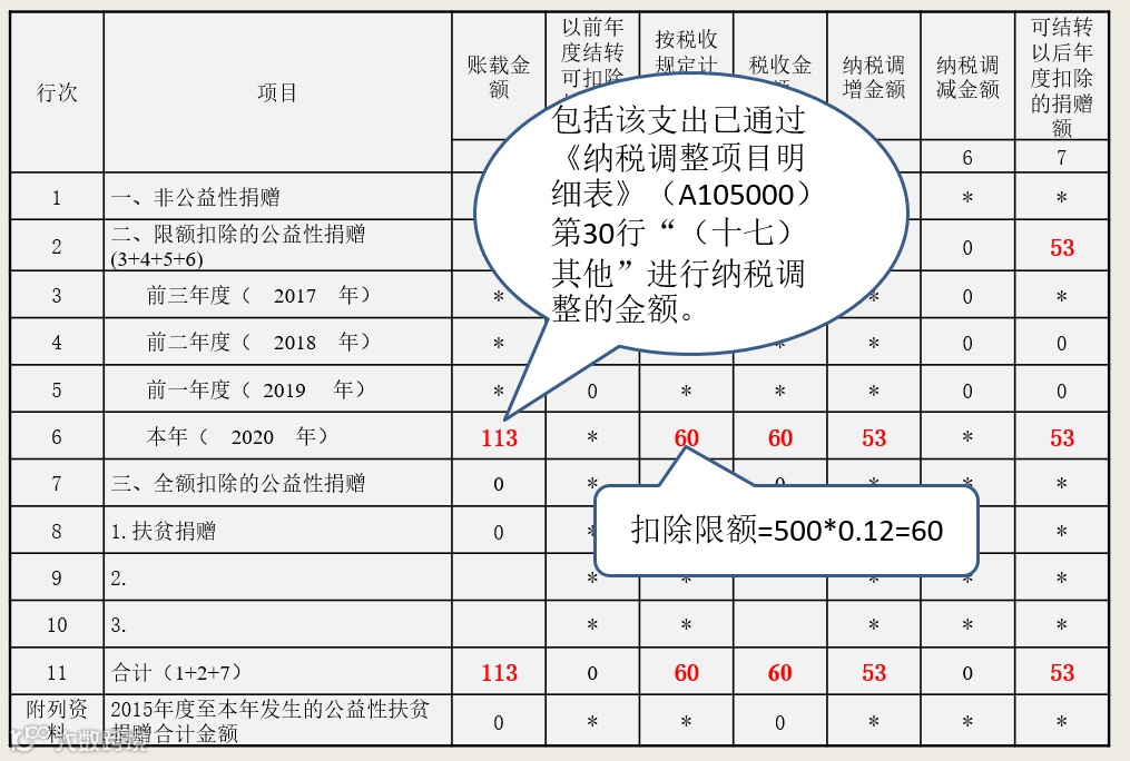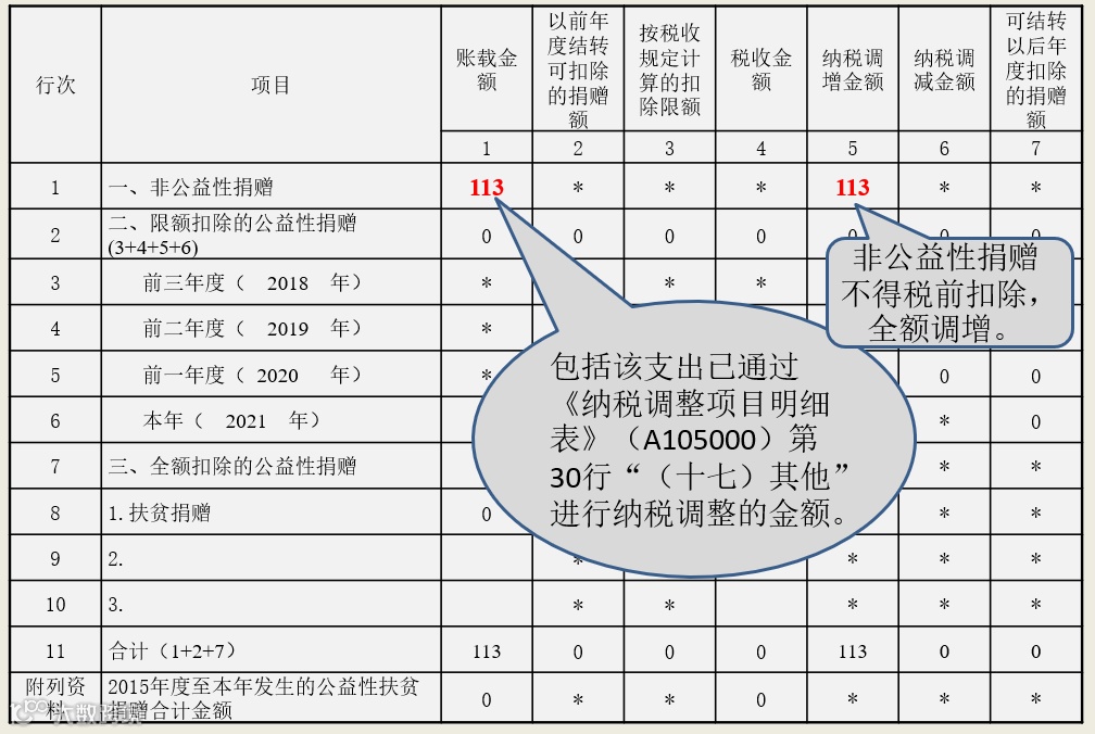 另外A105070 《捐赠支出及纳税调整明细表》“账载金额”:填报纳税人计入本年损益的公益性捐赠以外的其他捐赠支出金额,包括该支出已通过《纳税调整项目明细表》(A105000)第30行“(十七)其他”进行纳税调整的金额。