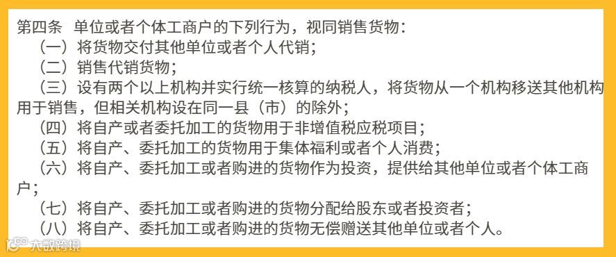 增值税,增值税暂行条例第四条第(八)款明确规定,单位或者个体工商户将自产、委托加工或者购进的货物无偿赠送其他单位或者个人的下列行为视同销售货物。