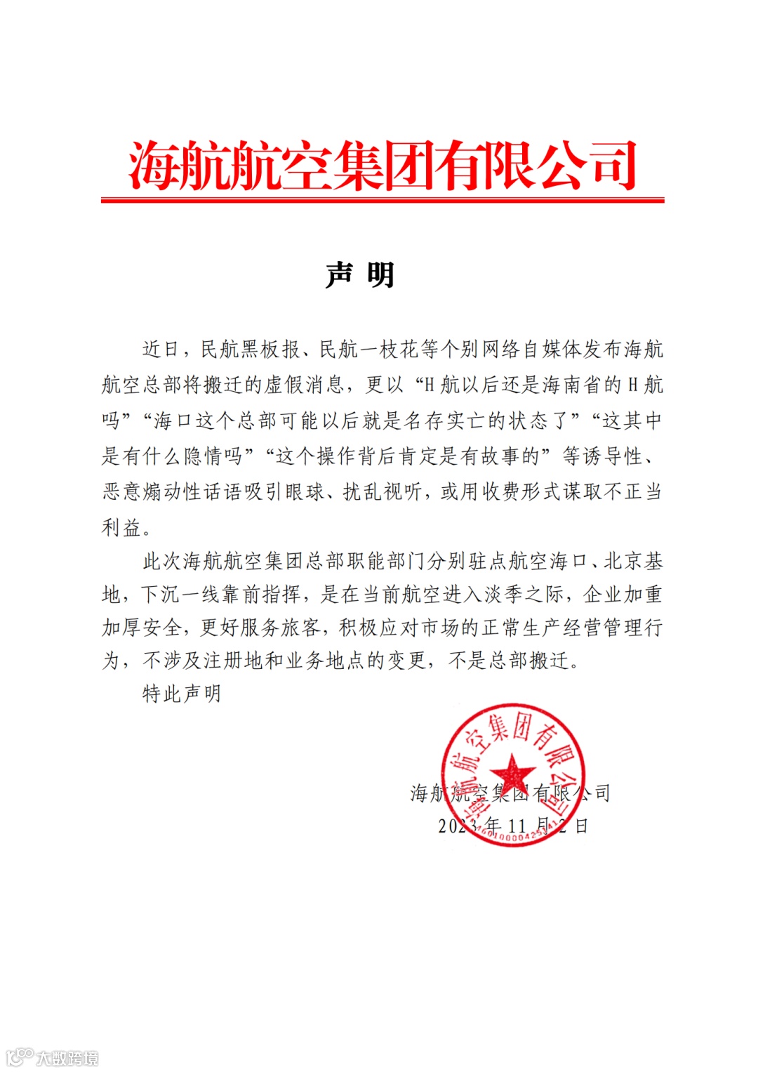 近日,民航黑板报、民航一枝花等个别网络自媒体发布海航航空总部将搬迁的虚假消息,更以“H航以后还是海南省的H航吗”“海口这个总部可能以后就是名存实亡的状态了”“这其中是有什么隐情吗”“这个操作背后肯定是有故事的”等诱导性、恶意煽动性话语吸引眼球、扰乱视听,或用收费形式谋取不正当利益。