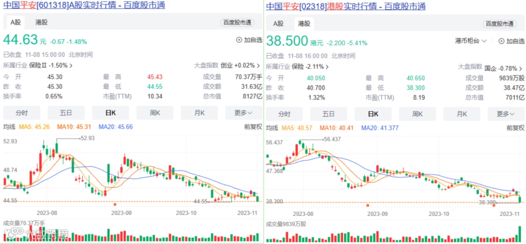 上述声明发布之后,平安A股及H股逐步企稳。最终A股下跌1.48%,报收44.63元/股。H股则收跌5.41%。