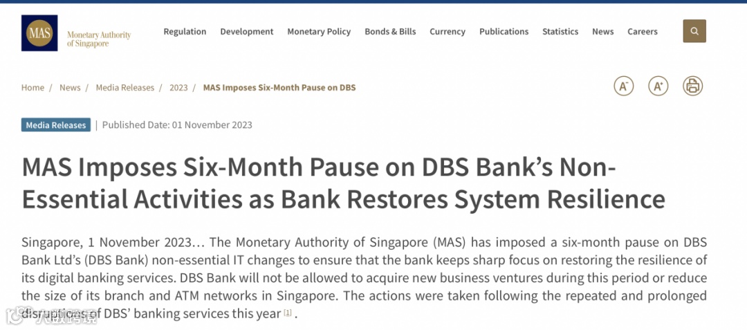 当地时间11月1日,新加坡金融监管局(MAS)公告称,对星展银行有限公司(DBS Bank Ltd)的非必要信息技术(IT)系统变更实施为期 6 个月的暂缓,以确保星展银行始终高度重视恢复其数字银行服务韧性。