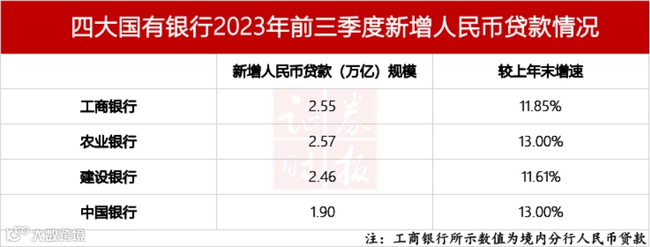 总的看,四大行在服务实体经济方面保持稳步增长,截至9月末,今年新增人民币贷款相较上年末均保持了双位数的增长,其中,农业银行和工商银行新增人民币贷款分别达到2.57万亿元和2.55万亿元,较上年末分别增长了13%和11.85%;建设银行和中国银行的新增人民币贷款则分别为2.46万亿元和1.9万亿元,较上年末分别增长了11.61%和13%。