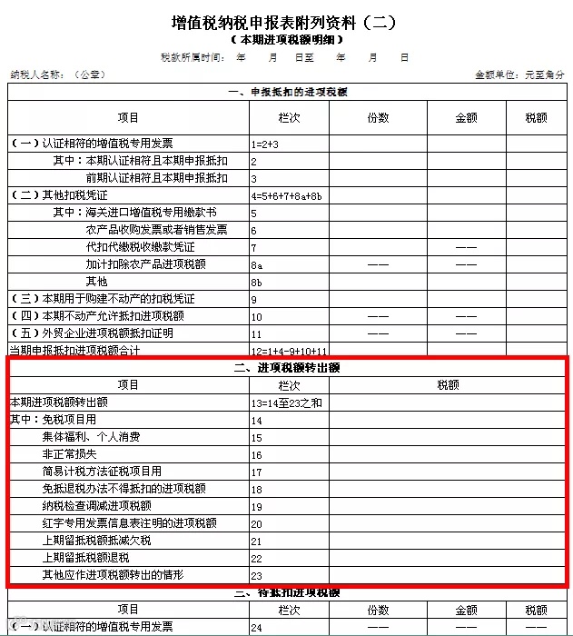 答:进项转出税额应填写在增值税一般纳税人申报表中的增值税纳税申报表附表二(本期进项税额明细表)第13至23栏中的相应栏次。您公司转出进项税额是因为进项为免征增值税项目用,故因将进项转出税额填在第14栏免税项目用中。