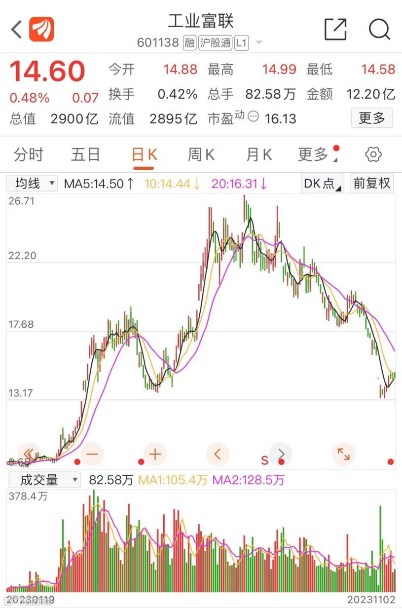10月以来,随着富士康集团被“双线”调查,工业富联股价经历连续下挫,截至11月2日收盘,报收14.6元/股,较年内高点回撤超46%,最新总市值为2900亿元。