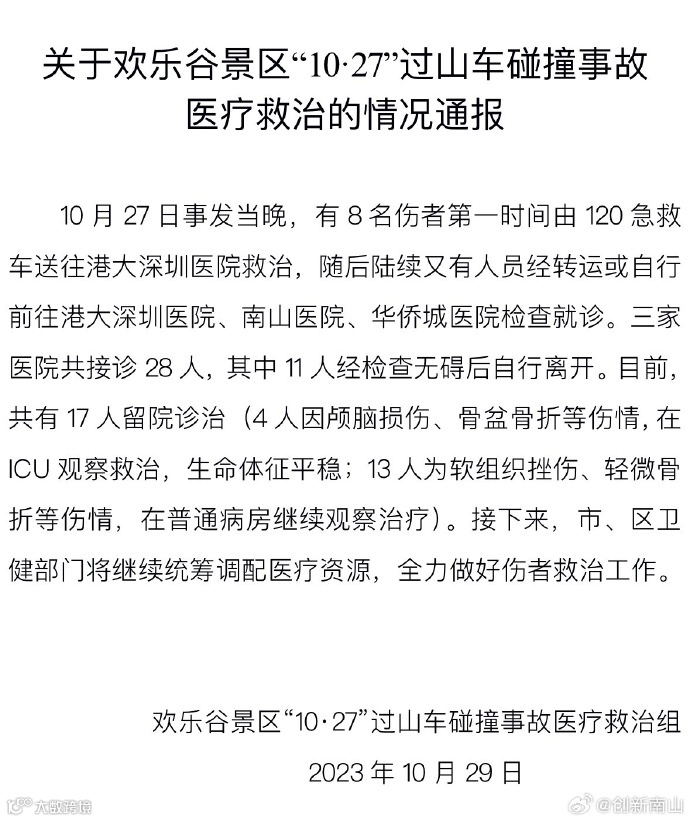 10月29日晚,@创新南山再发布《关于欢乐谷景区“10·27”过山车碰撞事故医疗救治的情况通报》: