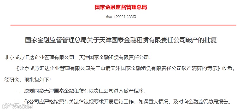 而最新消息显示,国家金融监督管理总局已向成方汇达、国泰金租发出《关于天津国泰金融租赁有限责任公司破产的批复》,原则同意国泰金租进入破产程序。