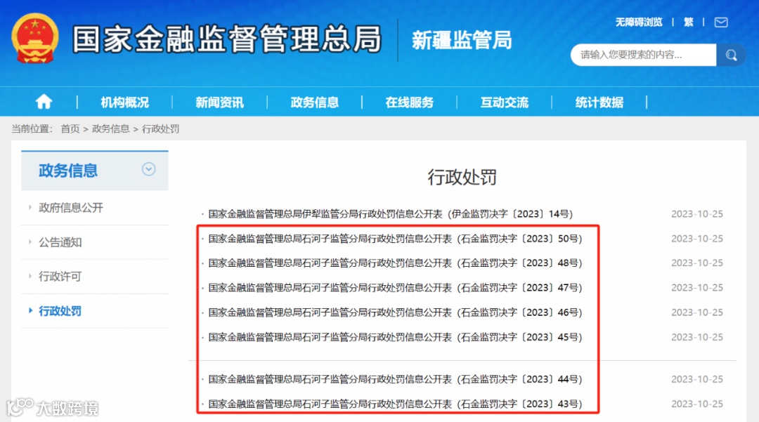 10月25日,国家金融监管总局新疆监管局一次性披露的7张个人罚单,这些罚单分别指向了位于石河子当地银行分支机构的工作人员。无一例外的是,这7人均遭到禁止终身从事银行业工作的行政处罚。