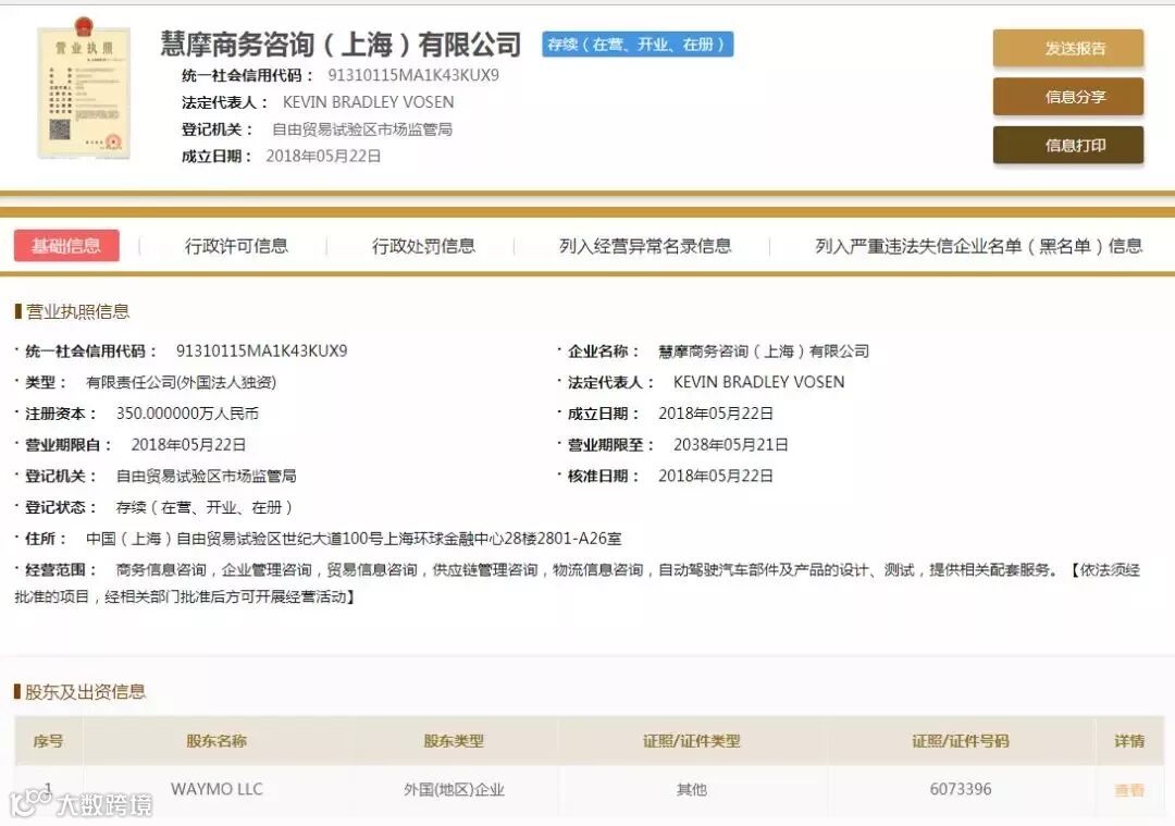 昨日,全天候科技查询国家企业信用信息公示系统发现,一家名为慧摩商务咨询(上海)有限公司今年 5 月在上海自贸区注册。该公司经营范围包括商务信息咨询、自动驾驶汽车部件及产品的设计、测试,提供相关配套服务等。