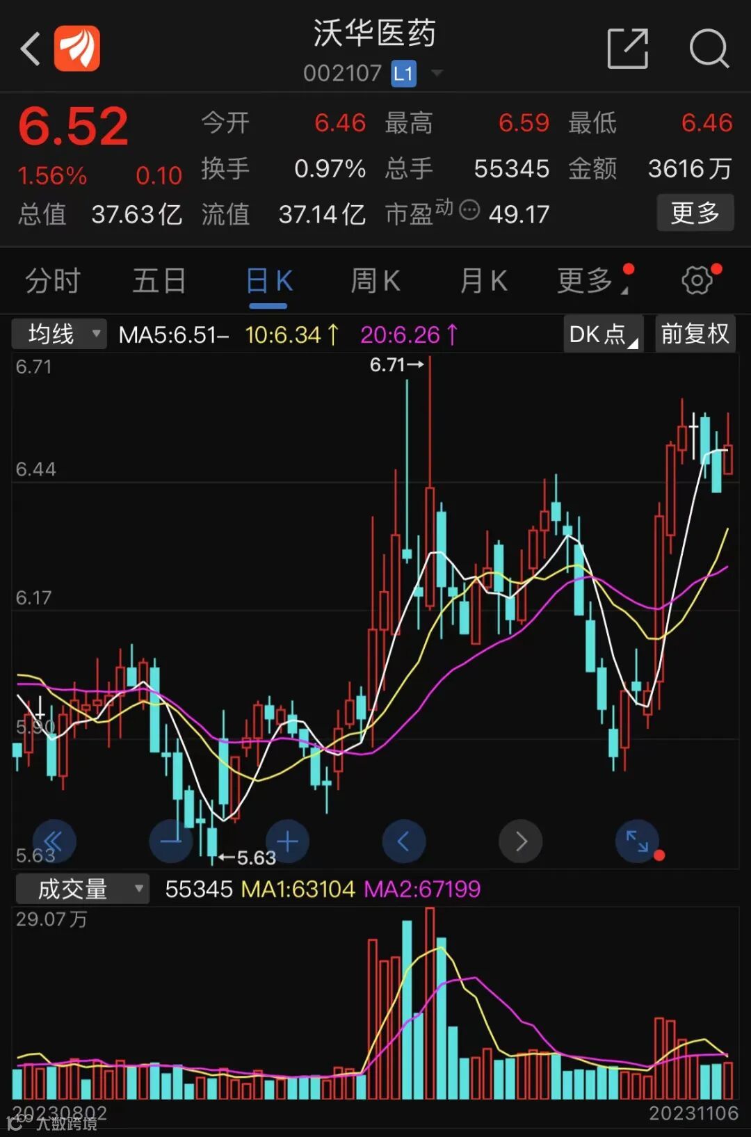 截至11月6日收盘,沃华医药股价小幅收涨1.56%,报6.52元/股,最新总市值约为37.6亿元。