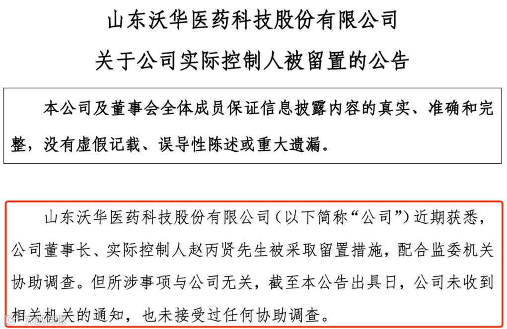 11月6日晚间,沃华医药发布公告称,近期获悉,公司董事长、实际控制人赵丙贤被采取留置措施,配合监委机关协助调查。