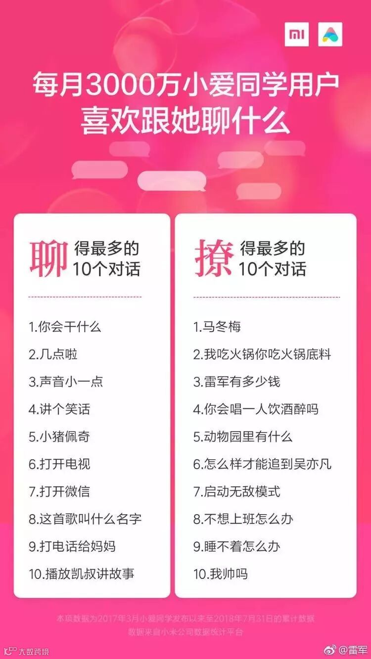 随后,雷军发布微头条称自己"仔细看了看3000万人和小爱同学聊的内容",并在微头条上公布了“每月3000万小爱同学用户喜欢跟她聊什么”,内容包括“聊得最多的10个对话”和“撩的最多的10个对话”。