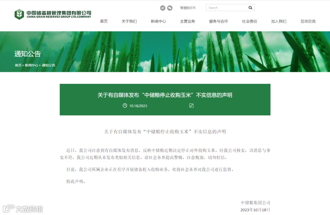 10月18日,中储粮集团公司发布《关于有自媒体发布“中储粮停止收购玉米”不实信息的声明》。