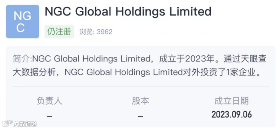 据资料显示,全新概念(三亚)投资集团有限公司成立日期为2023年9月25日,是一家以从事资本市场服务为主的企业,注册地址为海南省三亚市吉阳区迎宾路荣耀世纪大厦10楼1003号。该公司唯一的股东是一家香港公司:NGC Global Holdings Limited,于今年9月6日成立。
