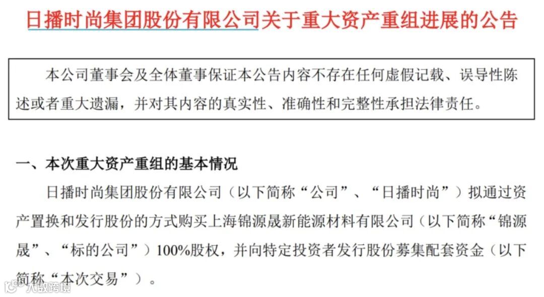 据日播时尚最新公告显示,公司拟从服装跨界到新能源,计划通过资产置换和发行股份的方式购买上海锦源晟新能源材料有限公司(以下简称“锦源晟”)100%股权。