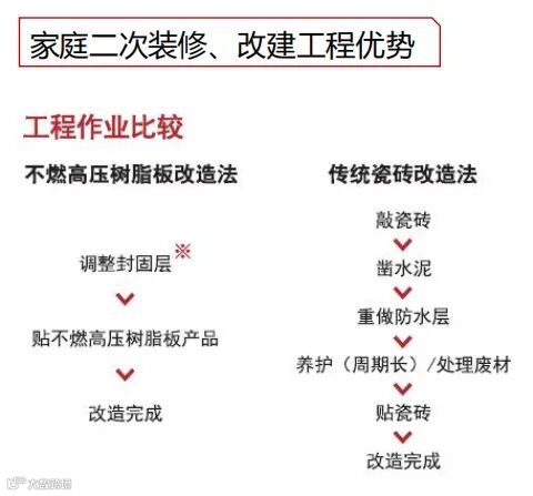 介绍说明:瑞欣产品旧改有别于传统旧改方法,传统翻新旧改需将原墙面铲除后重新做基层及防水后再贴产品,不仅耗时且产生过多建筑垃圾,增加了不少人工成本。瑞欣不燃高压树脂板可直接粘贴于原墙面,不拆除不破坏防水层,尺寸深化后现场直接安装,不产生建筑垃圾、不产生噪音扰民。产品可直接用于厨房、浴室、卫生间等高湿环境,即使在广东回南天气候及潮湿环境下也能保持墙面干爽清新状态。产品其“A级不燃、E0甲醛、除臭净味、防水防潮防霉”等特性使环境不再像传统墙漆等装饰材料充满甲醛味道,真正做到了即装即入住,令客户省心放心。