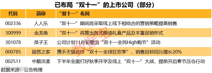作为每年年末影响力最大的电商促销节,上市公司自然是不会错过“双十一”这个大好时机。根据公告显示,不少上市公司正提前布局,比如零售连锁公司人人乐表示“双十一”期间将采取线上线下相结合的营销策略提高销售;国内最大粮油公司金龙鱼表示“双十一”将推出各式粮油礼盒产品及丰富促销形式;居然之家表示携手天猫合作“双十一全球狂欢季”,销售目标同比增长20%。