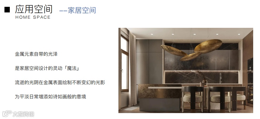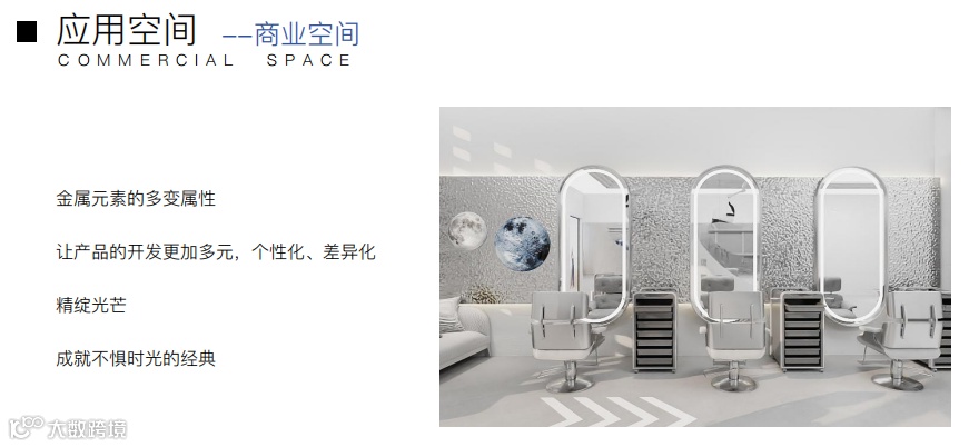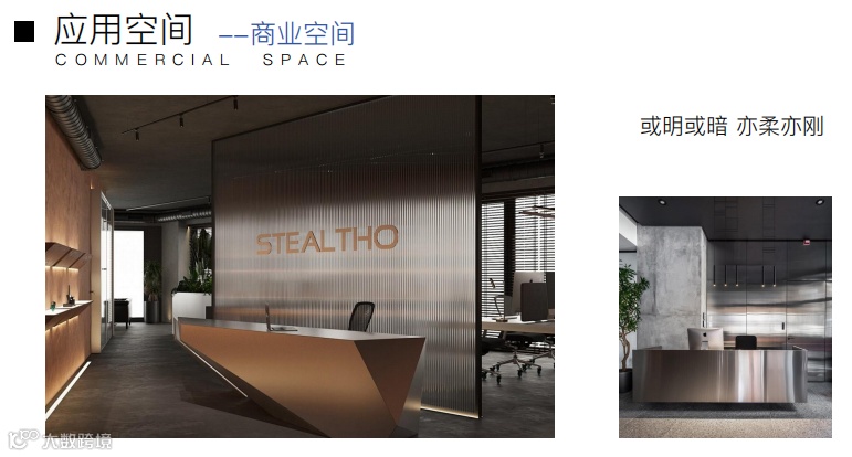 说明:瑞欣创意电镀金属板冷峻幽静的光泽,或明或暗,传达出高端精度和工业美感,无论是家居空间亦是商业空间都能完美匹配。