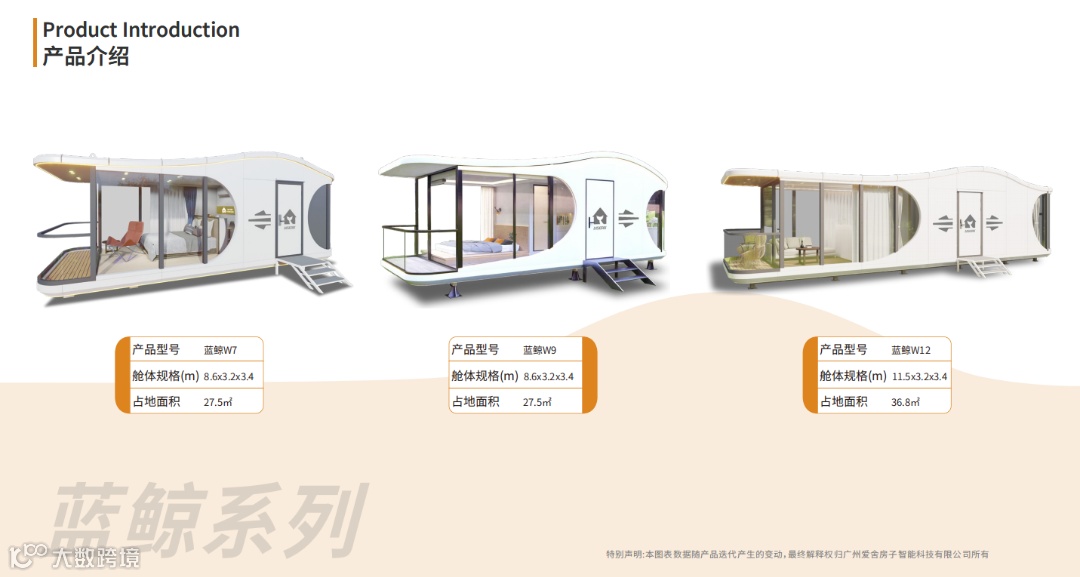 蓝鲸太空舱系广州爱舍房子智能科技有限公司旗下品牌,以自主创新的整体装配式设计理念,满足用户对野奢舒适的体验需求。产品以蓝鲸造型为设计出发点,内部搭配智能家居,具备人与自然、科技创新等特点。同时致力于推广新型智能移动建筑到景区、酒店、露营地、公共服务等各个领域,助力新农村旅游开发,推动民宿发展新业态。