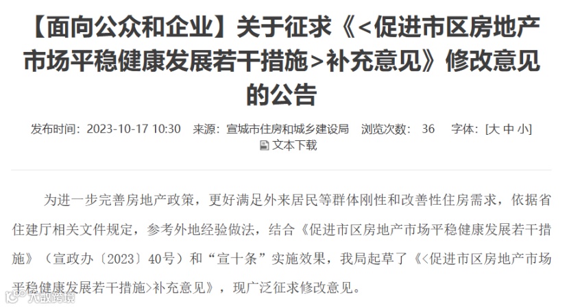 10月17日,宣城住建局就《<促进市区房地产市场平稳健康发展若干措施>补充意见》向公众征求修改意见。