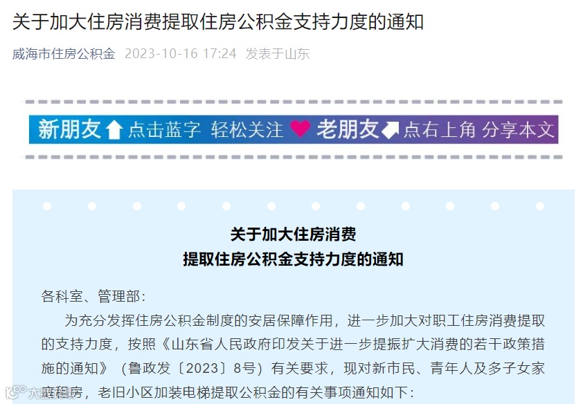 另外,10月16日,山东威海还发文加大提取住房公积金支持力度,对新市民、青年人及多子女家庭租房,以及老旧小区加装电梯提取使用公积金政策进行了优化。
