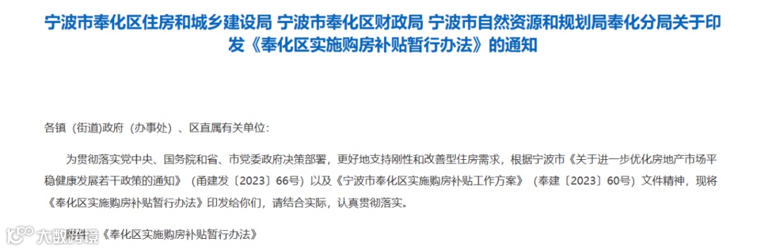 10月16日,浙江宁波市奉化区也提出实施购房补贴政策,购买新房的,一次性给予购房合同价款1%的货币补贴,但最高不超过4万元;购买二手房的,一次性给予完税价格1%的货币补贴,但最高不超过2万元。购房补贴实施时间自2023年10月1日起至2024年6月30日止。