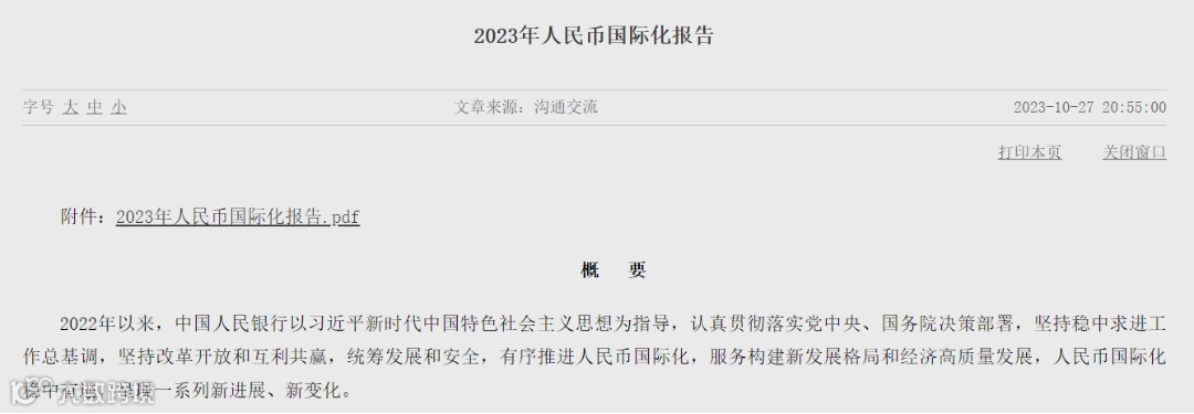 10月27日,人民银行发布2023年人民币国际化报告(下称报告)。