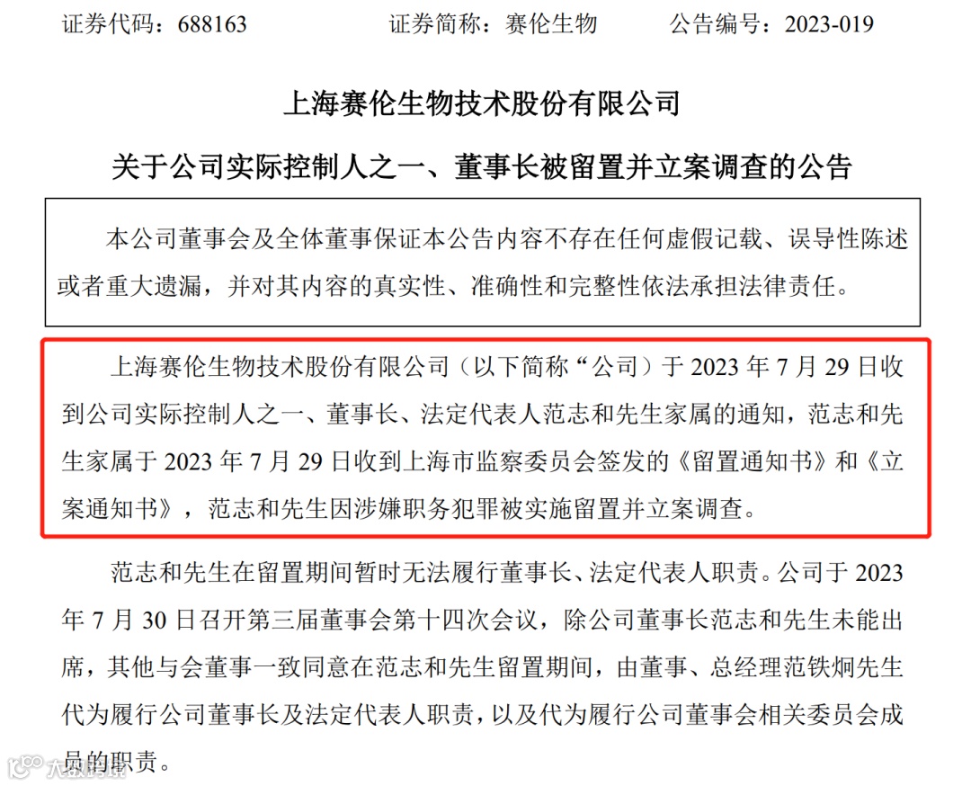 7月30日晚间赛伦生物披露,该公司7月29日收到实际控制人之一、董事长、法定代表人范志和家属的通知,其家属于当日收到上海市监察委员会签发的《留置通知书》和《立案通知书》,范志和因涉嫌职务犯罪被实施留置并立案调查。