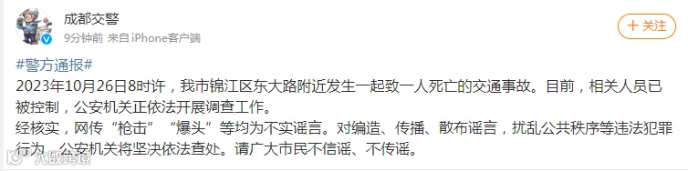 2023年10月26日8时许,我市锦江区东大路附近发生一起致一人死亡的交通事故。目前,相关人员已被控制,公安机关正依法开展调查工作。