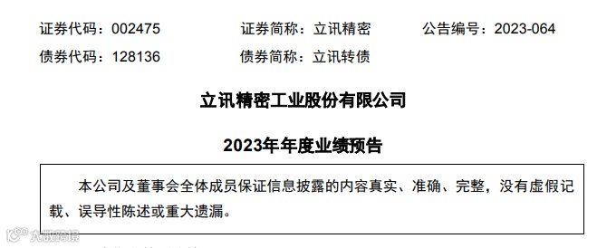 当日晚,立讯精密同步披露全年业绩预告,这也是A股首份2023年业绩预告。立讯精密预计2023年实现净利润107.67亿元-112.15亿元,相较上年同期的91.63亿元,同比增长17.5%-22.5%,基本每股收益1.51元–1.57元,2022年基本每股收益1.29元。