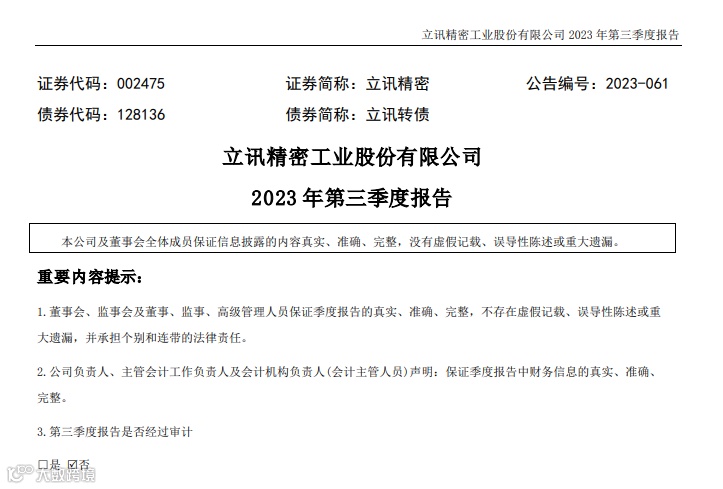 今年8月底,该公司曾披露三季报预告,预计其今年前三季度实现净利润70.40亿元-76.80亿元,同比增长10%-20%,并预计其第三季度盈利26.85亿元-33.25亿元,同比增长2.61%-27.08%。如此看来,立讯精密今年三季度业绩符合公司此前预期。