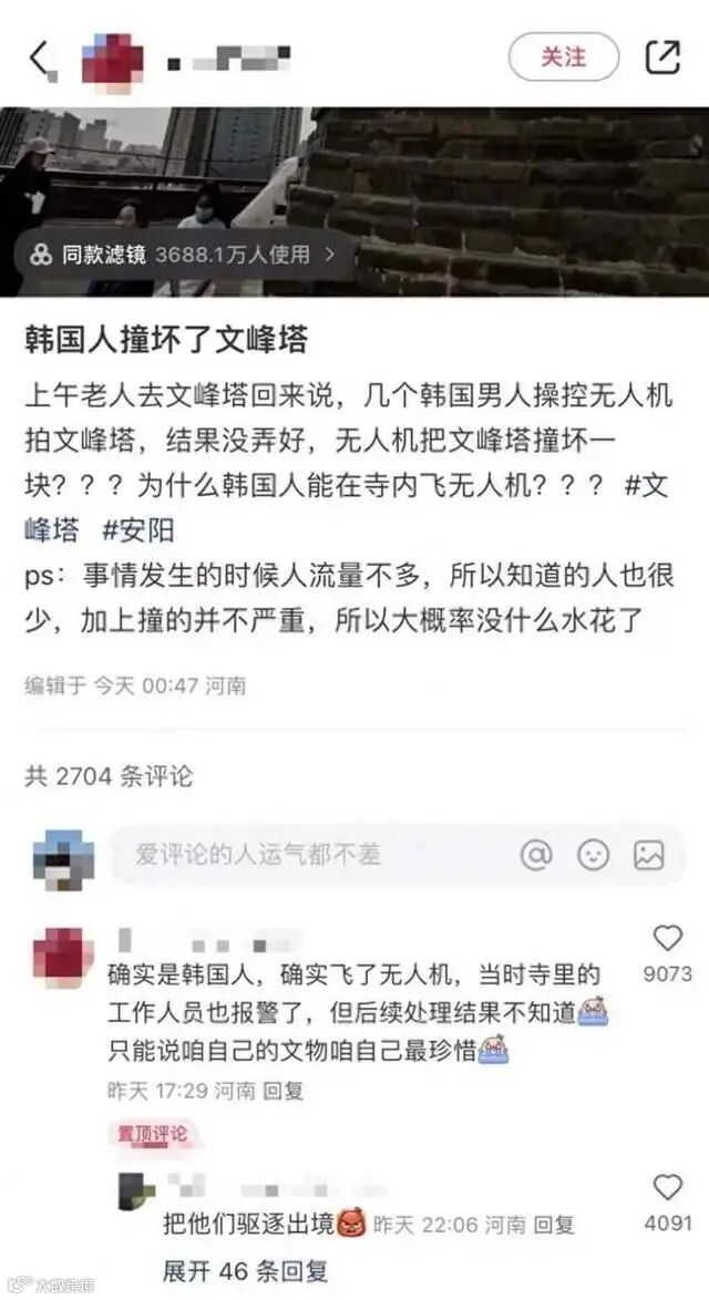 网友发文称,“有外国人操纵无人机拍摄文峰塔,结果没弄好,无人机把文峰塔撞坏了一块。为什么外国人能在寺内飞无人机?”该网友又评论区表示,“确实是外国人,确实飞了无人机,当时工作人员也报警了,后续处理情况不清楚……”