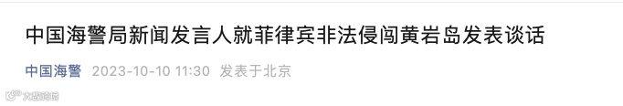 中国海警局新闻发言人甘羽表示,10月10日,菲律宾海军1艘炮艇不顾中方一再劝阻和警告,执意侵闯中国黄岩岛邻近海域。中国海警船在多次喊话警告无效的情况下,依法对菲船采取跟监外逼、航路管制等必要措施予以驱离,现场操作专业规范、正当合法。中国对黄岩岛及其附近海域拥有无可争辩的主权,对相关海域拥有主权权利和管辖权。菲方行为侵犯中方主权,严重违反国际法和国际关系基本准则,我们敦促菲方立即停止侵权行径。中国海警将依法在中国管辖海域持续开展维权执法活动,坚决维护国家主权和海洋权益。