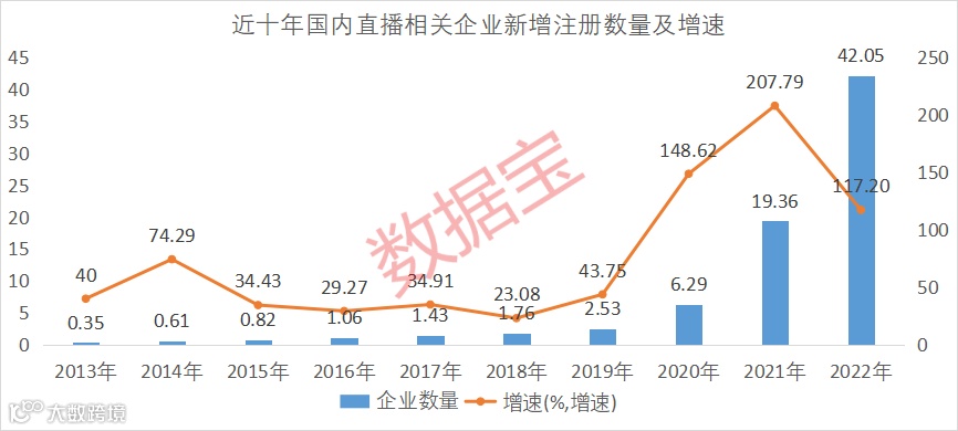 根据企查查数据显示,截至2023年9月11日,我国处于存续期(统计企业名称、品牌产品、经营范围含直播的企业)的直播相关企业近120万家。近十年来,直播相关企业注册量不断增加,2013年~2022年新增超76万家,2023年前8月新增直播相关企业53.76万家,同比增长104.49%,已超过2022全年;其中2020年~2023年增速持续超过100%。
