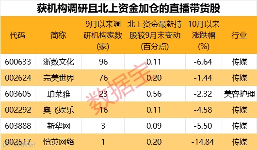 证券时报·数据宝统计,A股市场布局直播带货的股有60余只,主要分布在12个行业,其中传媒、商贸零售及计算机行业公司数量居前。从北上资金持股来看,10月以来获北上资金加仓(较9月末比)的个股多达25只,占比接近一半。珀莱雅、三只松鼠加仓幅度居前,其中珀莱雅2022年度品牌成交金额获抖音美妆排名第三, 国货排名第一;三只松鼠设立直播专项团队,依托品牌IP属性构建独有的语言体系和直播风格,在行业内率先开始自直播、虚拟直播的研究和探索。