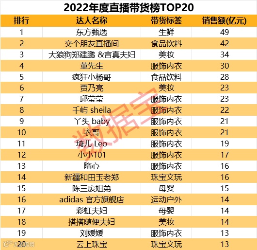 带货真有那么赚钱吗?数据似乎可以说明一切。由专注直播数据的平台考古加公布的“2022年度直播带货榜TOP100”显示,带货前五的公司或网红2022年销售额均超过25亿元,前十带货额均超过20亿元。由新东方转型的“东方甄选”带货位居榜首,高达49亿元;“真还传”罗永浩带火的“交个朋友直播间”居榜单第2位,带货收入高达42亿元。“疯狂小杨哥”带货收入达28亿元,居榜单第5位,据悉“疯狂小杨哥”最早是由两兄弟拍摄搞笑视频为主,2021年成立“合肥三只羊网络科技有限公司”,目前已在安徽买楼,孵化多个千万级GMV直播间。