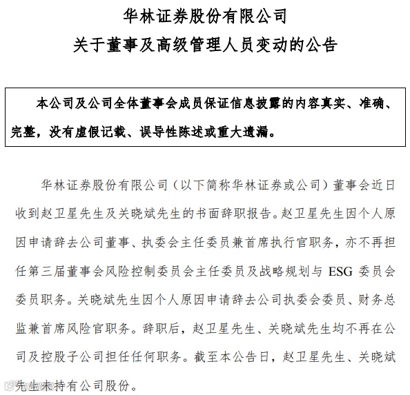 与此同时,原首席执行官兼执委会主任委员赵卫星因个人原因申请辞去相关职务。华林证券在公告中表示,赵卫星任职期间,积极推动公司科技金融转型,董事会对赵卫星为公司发展做出的贡献表示感谢。