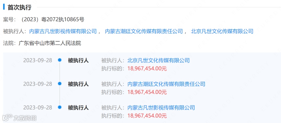 值得注意的是,公开信息显示,近日,吴亦凡关联公司北京凡世文化传媒有限公司、内蒙古潮廷文化传媒有限责任公司、内蒙古凡世影视传媒有限公司新增一则被执行人信息,执行标的1896万余元,执行法院为中山市第二人民法院,关联案件为华帝股份有限公司与上述公司相关服务合同纠纷。