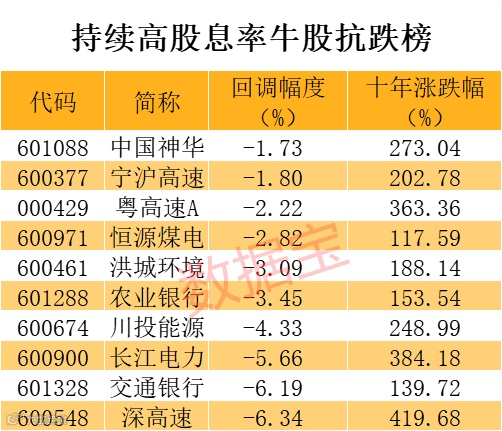 一批抗跌的超级慢牛股也浮出水面。上述翻倍股中,有中国神华、宁沪高速、粤高速A等13只个股最新价较十年来高点回撤不足10%。其中,宁沪高速、粤高速A等个股近期更是创出历史新高。