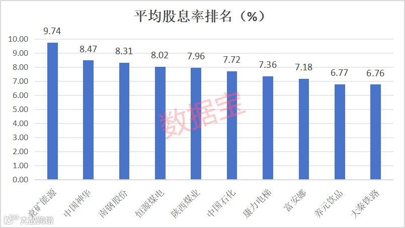 排名第二位的是超级大白马中国神华,最新总市值接近6500亿元,近五年股息率分别为9.23%、11.28%、10.05%、6.90%和4.9%,平均股息率为 8.47%。另外,南钢股份、恒源煤电、陕西煤业、中国石化、康力电梯、富安娜等个股平均股息率均超7%。