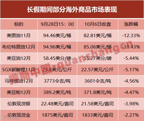 浙商期货统计显示,长假期间,纽约WTI原油期货11月合约累计跌幅达到12.33%,布伦特原油12月合约以10.43%的跌幅紧随其后。海外碳酸锂、棕榈油、豆油、豆粕、白银、黄金等品种也都有较大幅度下跌。